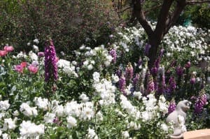 a true rose garden raging with blooms on entering the driveway and beddings closest to the house. Predominant colours are pinks, purples and whites. Visit her garden…